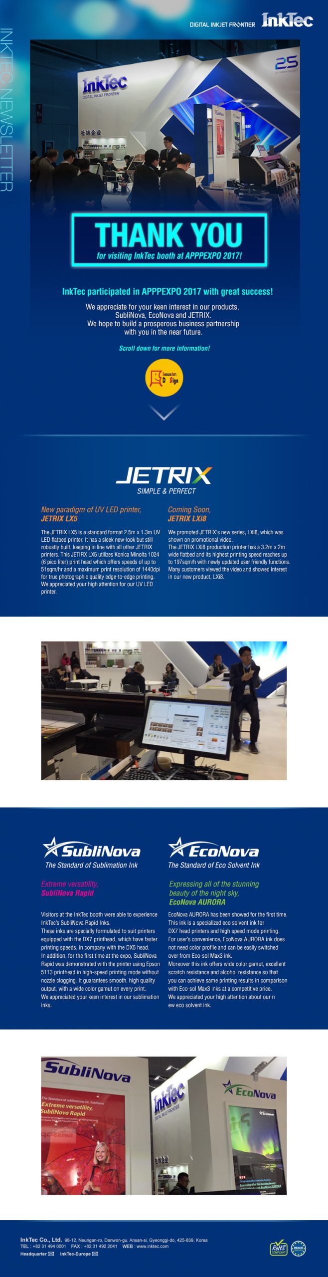 Tin Tức InkTecAPPPEXPO 2017 Thanks letter Đăng vào 21 Tháng 9, 202521 Tháng 9, 2025 bởi mrtodesigner@gmail.com Đánh giá InkTec Broadcasting – Introduce of InkTec Digital Printing Business Division Kyunghyang Housing Fair