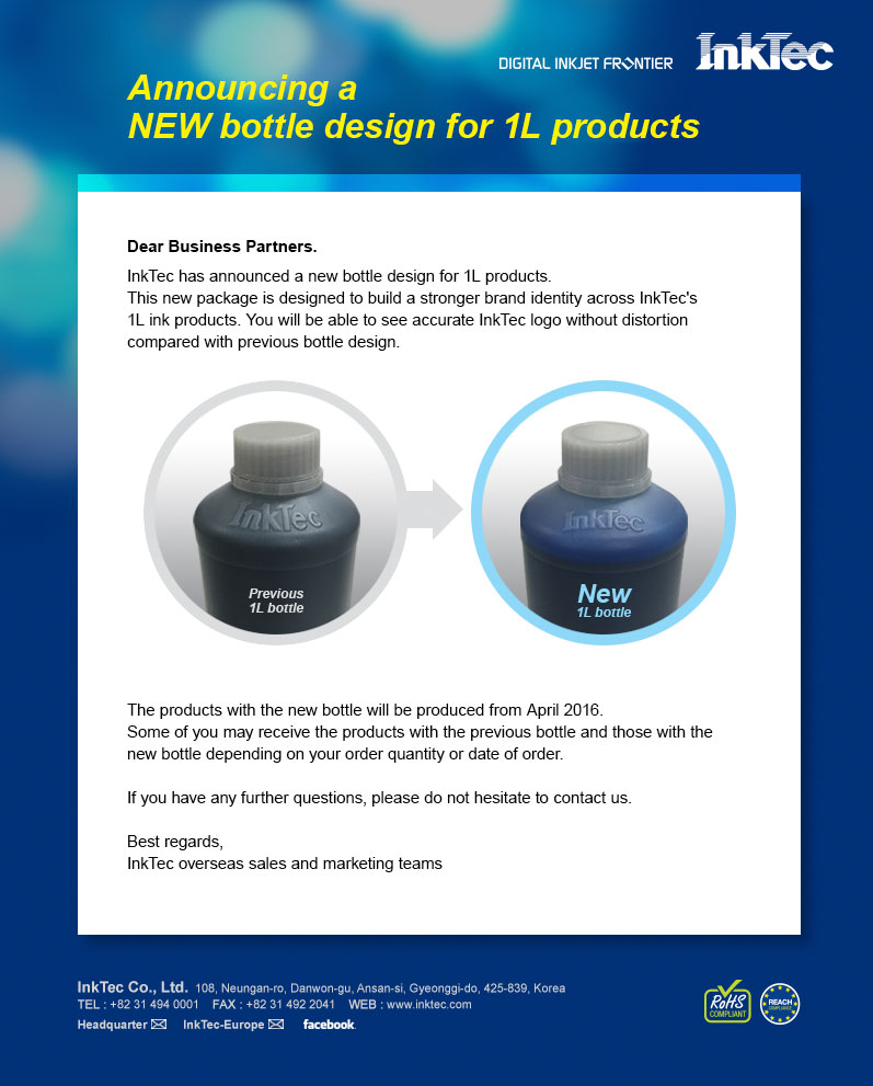 Tin Tức InkTecNew bottle design for 1L products Đăng vào 21 Tháng 9, 2025 bởi mrtodesigner@gmail.com Đánh giá FESPA, APPPEXPO 2016 Thanks letter InkTec launches an official Facebook page