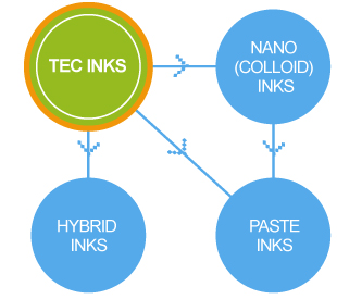 Dựa trên mực TEC của riêng InkTec, InkTec đã và đang phát triển và cung cấp nhiều loại vật liệu với phương pháp in chuyên biệt và các sản phẩm ứng dụng. Với nhiều thập kỷ tích lũy kỹ năng kỹ thuật, chúng tôi có khả năng kiểm soát độ nhớt tự do và đáp ứng tối ưu nhu cầu của khách hàng. Các vật liệu hiện đang được InkTec sản xuất và phân phối bao gồm Ag Cluster Complex dựa trên mực TEC. Ngoài ra còn có dạng bột nhão sử dụng phân tán nano và bột nano, dạng lai sử dụng phức hợp Ag và Nano/Flake, được ứng dụng trong nhiều quy trình in ấn khác nhau, chẳng hạn như in phun, in lưới, in phun và in cuộn (in khắc lõm, in Flexo, in khắc lõm offset, v.v.). Ngoài các điện cực thông thường, chúng còn được sử dụng cho các mục đích chức năng (sản phẩm quang học/trang trí).